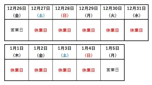 年末年始休業のお知らせ